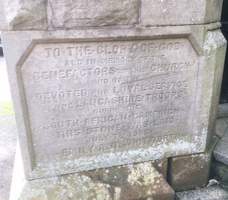 On the South face: Names of those on the Building Committee for the church On the East face: To the Glory of God/ and in Memory of the/ Benefactors of this Church/ and of the/ Devoted and Loyal Service/ of the Lancashire Troops/ during the/ South African Campaign/ This Stone was laid/ July 7th 1900/ by Emily A N Whitworth.