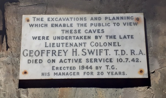 THE EXCAVATIONS AND PLANNING / WHICH ENABLE THE PUBLIC TO VIEW / THESE CAVES / WERE UNDERTAKEN BY THE LATE / LIEUTENANT COLONEL / GEOFFREY H. SWIFT. T.D. R.A. / DIED ON ACTIVE SERVICE 10.7.42. / ERECTED 1944 BY T.G. / HIS MANAGER FOR 20 YEARS.
