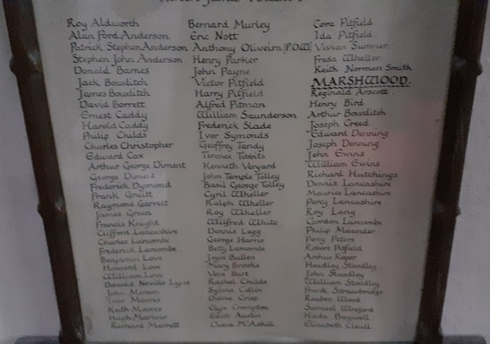 ROLL OF SERVICE. / Killed in Action / [names x 4] / [Served]: [names x 69] / MARSHWOOD / [names x 26]