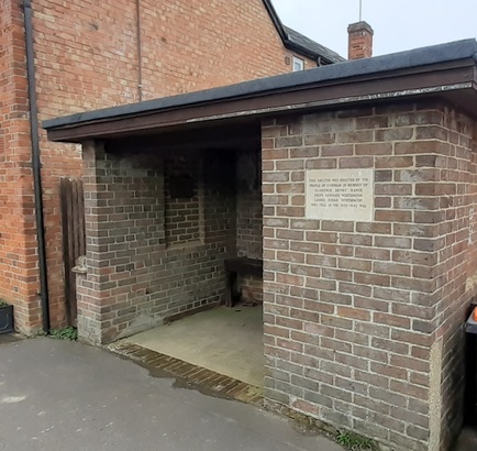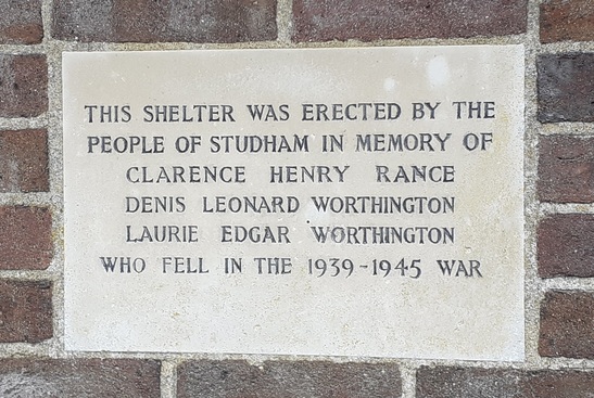THIS SHELTER WAS ERECTED BY THE / PEOPLE OF STUDHAM IN MEMORY OF / [Names x 3] / WHO FELL IN THE 1939 - 1945 WAR
