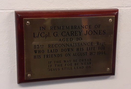 IN REMEMBRANCE OF / L/Cpl. G. CAREY JONES / 53RD RECONNAISSANCE Regt. / WHO LAID DOWN HIS LIFE FOR / HIS FRIENDS ON AUGUST 18TH 1944. / IF THE WAY BE DREAR, / IF THE FOE BE NEAR, / "JESUS STILL LEAD ON."