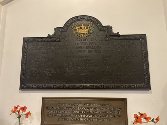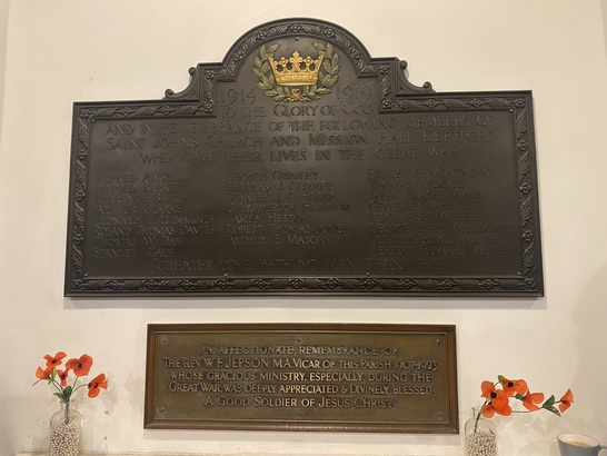 1914 1919 / TO THE GLORY OF GOD / AND IN REMEMBRANCE OF THE FOLLOWING MEMBERS OF / SAINT JOHN'S CHURCH AND MISSION HALL DEPTFORD WHO GAVE THEIR LIVES IN THE GREAT WAR / [names] / "GREATER LOVE HATH NO MAN THAN THIS"