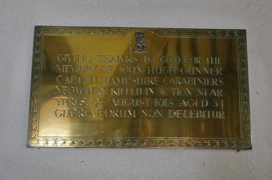 Giving thanks to God for the memory of John Hugh Gunner Captain Hampshire Carabiniers Yeomanry, killed in action near Ypres 9th August 1918 aged 34 Gloria eorum non delebitur.
