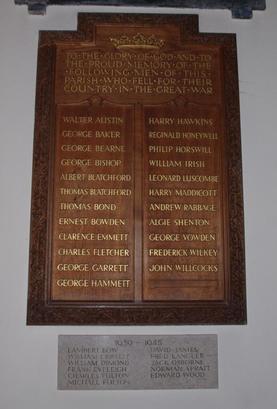 BOARD: TO THE GLORY OF GOD AND TO/ THE PROUD MEMORY OF THE/ FOLLOWING MEN OF THIS/ PARISH WHO FELL FOR THEIR/ COUNTRY IN THE GREAT WAR/ (NAMES) TABLET: 1939 - 1945/ (NAMES)