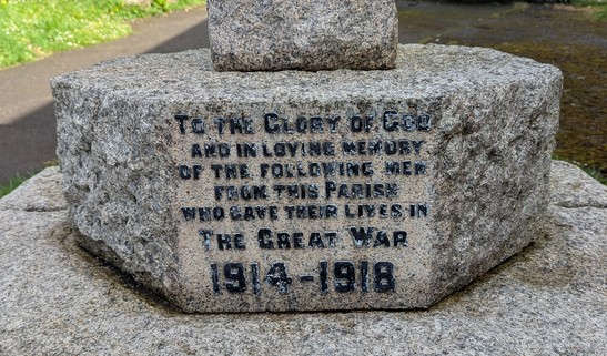 Top step face: TO THE GLORY OF GOD / AND IN LOVING MEMORY / OF THE FOLLOWING MEN / FROM THIS PARISH / WHO GAVE THEIR LIVES IN / THE GREAT WAR / 1914 - 1918 / Three middle step faces: (17 NAMES)