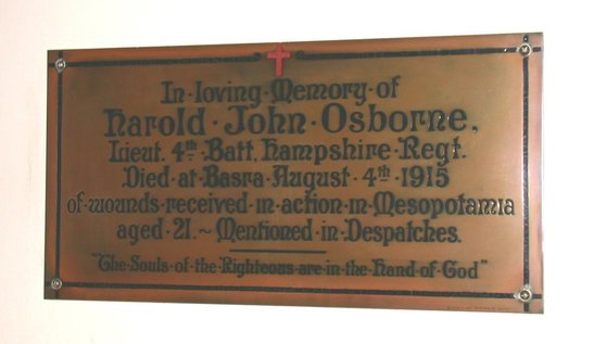 In loving memory of Harold John Osborne, Lieut. 4th Batt. Hampshire Regt. Died at Basra. August 4th 1915 of wounds recieved in action in Mesopotamia Aged 21. Mentioned in despatches. "The Souls of the Righteous are in the Hand of God."