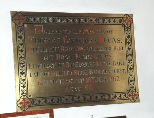 Sacred to the memory of Thomas Farquhar Lucas Lieutenant Royal Warwickshire Regt. and Royal Flying Corps. Elder son of Sir Edward Lucas, Bart. Late of Whitley Ridge, Brockenhurst. Killed in action 16th June 1917, Aged 30.