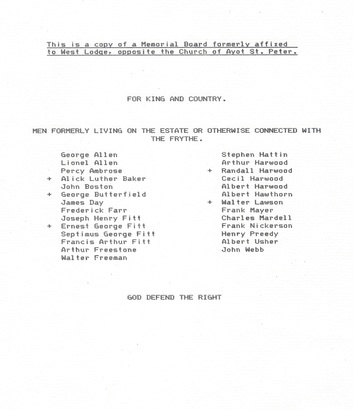 This is a copy of a Memorial Board formerly affixed / to West Lodge, opposite the Church of Ayot St. Peter. / FOR KING AND COUNTRY. / MEN FORMERLY LIVING ON THE ESTATE OR OTHERWISE CONNECTED WITH / THE FRYTHE. / [Names x 27] / GOD DEFEND THE RIGHT