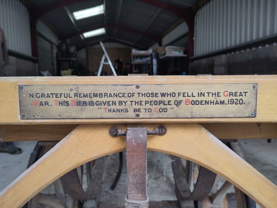 IN GRATEFUL REMEMBRANCE OF THOSE WHO FELL IN THE GREAT WAR, THIS BIER IS GIVEN BY THE PEOPLE OF BODENHAM, 1920. "THANKS BE TO GOD"