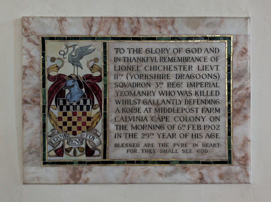 TO THE GLORY OF GOD AND / IN THANKFUL REMEMBRANCE OF / LIONEL CHICHESTER LIEVT. / 11TH (YORKSHIRE DRAGOONS) / SQVADRON 3RD REGT IMPERIAL / YEOMANRY WHO WAS KILLED / WHILST GALLANTLY DEFENDING / A KOPJE AT MIDDLEPOST FARM / CALVINIA CAPE COLONY ON / THE MORNING OF 6TH FEB. 1902 / IN THE 29TH YEAR OF HIS AGE / BLESSED ARE THE PURE IN HEART / FOR THEY SHALL SEE GOD