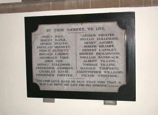 Window - To the Glory of God and in grateful memory of those from this parish who gave their lives for us in the Great War 1914-1919. This window is erected by St Martin's Guild East Woodhay 1921 Tablet - By their sacrifice, we live. (Names) "Greater love hath no man than this that a man lay down his life for his friends."St.John.XV.13