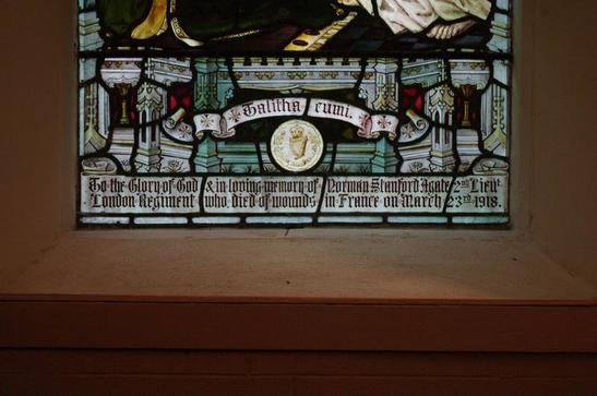 To the Glory of God & in loving memory of Norman Stanford Agate. 2nd Lieut. London Regiment who died of wounds in France on March 23rd 1918.