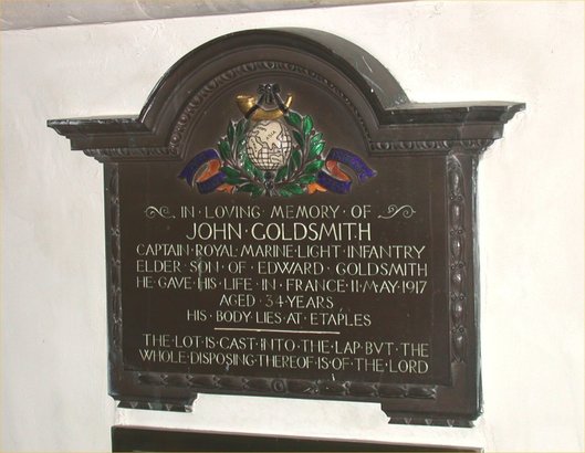In loving memory of JOHN GOLDSMITH Captain Royal Marine Light Infantry Elder son of Edward Goldsmith He gave his life in France 11 May 1917 Aged 34 years his body lies at Etaples The lot is cast into the lap but the whole disposing thereof is of the Lord