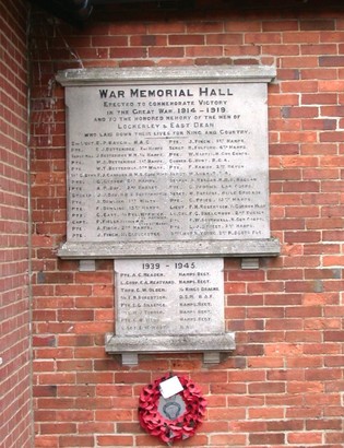 WW1 - War Memorial Hall erected to commemorate victory in the Great War. 1914 - 1919. and to the honoured memory of the men of Lockerley and East Dean who laid down their lives for King and Country WW2 - 1939-1945