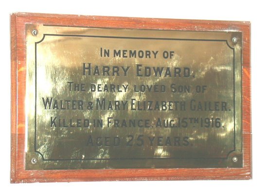 In memory of/ Harry Edward,/ The dearly loved son of/ Walter & Mary Elizabeth Gailer./ Killed in France, Aug. 15th 1916, Aged 25 years.