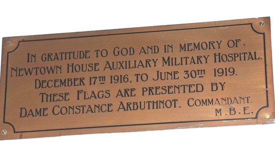 In gratitude to God and in memory of Newtown House Auxiliary Military Hospital. December 17th 1916, to June 30th 1919. These Flags are presented by Dame Constance Arbuthnot, Commandant, M.B.E.