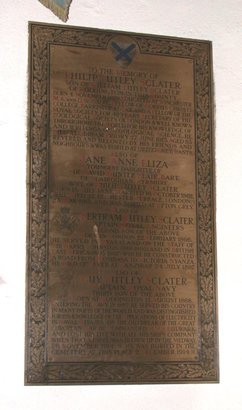 Also of Guy Lutley Sclater Captain, Royal Navy third son of the above Born at Hoddington 15. August 1868. Entering the Navy in 1882 he served his Country in many parts of the world and was distinguished for his knowledge of the Applications of Electricity in Naval Affairs. on the outbreak of the Great European War he Commanded H.M.S. Bulwark and lost his life with all his ship's company when that vessel was blown up in the Medway 26. November 1914 he was buried in the cemetery at this place 2. December 1914
