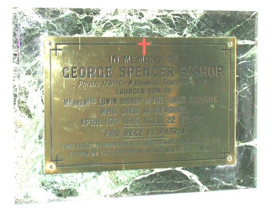 In memory of George Spencer Bishop Private 178th Co. Mechanical Transport A.S.C. Younger son of Mr. and Mrs. Edwin Bishop of The Lawns, Swanwick. Who died at Reading, April 10th 1915, aged 22 years. "Pro Rege et Patria" This tablet is placed here in affectionate remembrance and esteem by the Officers, N.C.O.'s and Men of his company.