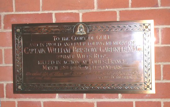 To the Glory of God and in proud and ever loving memory of Captain William Bristow Gardner, M.C. 2nd Batt: Wilts Regt. killed in action at Foues, France March 28th 1918, aged 29 years. We asked life of Thee and Thou gavest him a long life, even for ever and ever. Erected by his Parents
