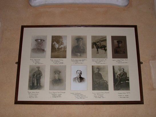 First row: Private Ralph Moody 2nd Hampshire at Gallipoli April 28th 1915 Private Leonard Dowling 4th Hampshire at Kut-El-Almara January 21st 1916 Private George Warren Whidborne City of London Artists Rifles at Etaples March 6th 1916 Sergeant Edgar Runyeard R.A. Mentioned in despatches at Poperinghe March 20th 1916 Captain Godfrey Philpot R.G.A. the Somme September 1st 1916 Second row: Private Albert Roud 8th Devonshired Killed in action May 7th 1917 Lance Corporal John T. Willmott Coldstream Guards Killed in action November 30th 1917 Second Lieutenant S. Montague Olden 1st Border Regiment Vieux Becquien - France May 14th 1918 Lance Corporal Arthur Thornton 15th Hampshires Killed in action 2nd October 1918 Herbert Olden R.F.A. Killed in action 3rd October 1918