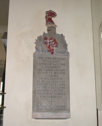 The Lord Richard Wellesley Captain of No.3 Compy. 1st Battalion Grenadier Guards 2nd son of Arthur 4th Duke of Wellington Born 30 Sept. 1879 Killed 29 Oct. 1914 at Ypres, Belgium fighting in the Great War against the Germans + His wife Nesta set this stone here in his memory