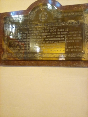 IN LOVING MEMORY OF/MAJOR NEIL FRASER GORDON/ROYAL FIELD ARTILLERY/ENTERED INTO REST OCT 31ST 1904 AGED 33/HE TOOK PART IN THE DEFENCE OF LADYSMITH AND DID SIGNAL SERVICE IN/COMMAND OF A 63" HOWITZER GUN. HIS ABILITY AND DEVOTION TO HIS/POSITION WERE GREATLY APPRECIATED BY HIS SUPERIOR OFFICERS AND THE INTEREST/HE TOOK IN HIS MEN ? HIM THE LOVE OF ALL SERVING UNDER HIM//THE MEMORY OF ??/ERECTED BY HIS WIFE AND RELATIONS.../....