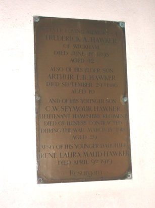 and of his younger son C.W. Seymour Hawker Lieutenant Hampshire Regiment died of illness contracted during the War March 13th 1918 aged 29 also of his younger daughter Rene Laura Maud Hawker died April 9th 1919 * Resurgam *