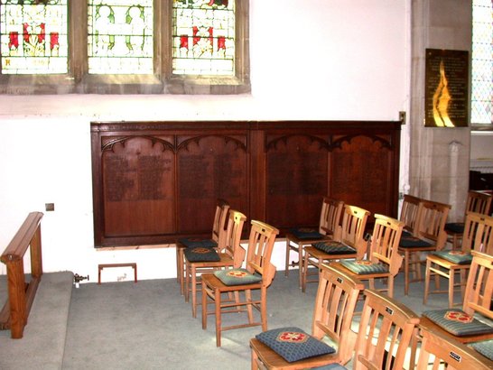 1st screen - To the Glory of God and in memory of the men who gave (Names) 2nd screen - their lives 1914 - 1918. Their name liveth for evermore (Names)