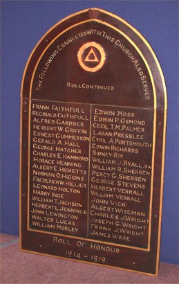 1st bboard - In humble gratitude to the memory of those who have made the SUPREME SACRIFICE (Names) The following also served (Names) 2nd board - ROLL OF HONOUR 1914 - 1919 The following connected with this church also served Roll continued (NaROLL OF HONOUR 1914 - 1919mes)