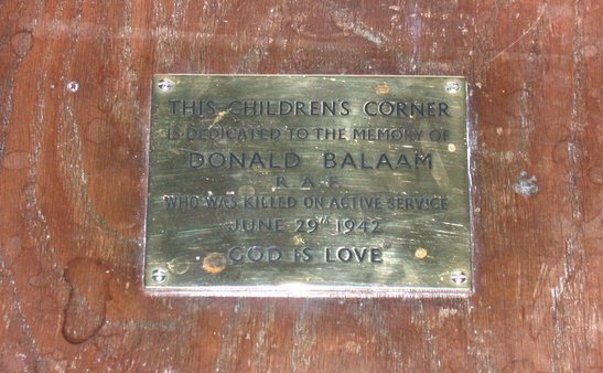 This Children's Corner/is dedicated to the memory of/Donald Balaam/R.A.F./who was killed on active service/June 29th 1942/God is Love