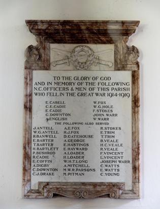TO THE GLORY OF GOD/ AND IN MEMORY OF THE FOLLOWING/ N C OFFICERS & MEN OF THIS PARISH/ WHO FELL IN THE GREAT WAR 1914-1919/ (NAMES)/ THE FOLLOWING ALSO SERVED/ (NAMES)