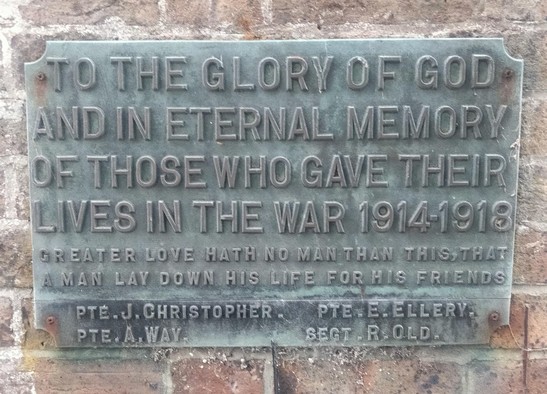 TO THE GLORY OF GOD/ AND IN ETERNAL MEMORY/ OF THOSE WHO GAVE THEIR/ LIVES IN THE WAR 1914-1918/ GREATER LOVE HATH NO MAN THAN THIS, THAT A MAN LAY DOWN HIS LIFE FOR HIS FRIENDS (NAMES)