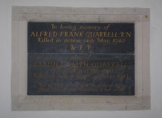 IN LOVING MEMORY OF ALFRED FRANK QUENELL R.N./ KILLED IN ACTION 14TH MAY 1940 R.I.P. ALSO OF SAMUEL RALPH QUENELL, QUEEN'S ROYAL REGT/ KILLED IN ACTION 9TH SEPTEMBER 1943/ "AND WITH THE MORN THOSE ANGEL FACES SMILE WHICH I HAVE LOVED LONG SINCE AND LOST AWHILE"