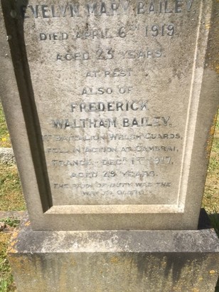 In / Loving Memory of / Evelyn Mary Bailey / Died April 6th 1919 / aged 23 years / at rest / also of / Frederick / Waltham Bailey / 1st Battalion Welsh Guards / Fell in Action at Cambrai / France - Dec 1st 1917 / Aged 29 years / The Path of Duty was the / Way to Glory.