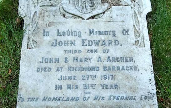 John Edward Archer died at Richmond Barracks, June 27th 1917 in his 31st year.