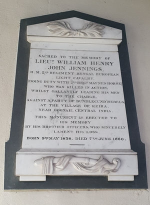 SACRED TO THE MEMORY OF / LIEUT WILLIAM HENRY / JOHN JENNINGS / H.M. 2ND REGIMENT BENGAL EUROPEAN / LIGHT CAVALRY, / (DOING DUTY WITH 2ND REGIMENT MAYNES HORSE) / WHO WAS KILLED IN ACTION, / WHILST GALLANTLY LEADING HIS MEN / TO THE CHARGE / AGAINST A PARTY OF BUNDLECUND REBELS, / AT THE VILLAGE OF KEIRA, / NEAR GOONAH, CENTRAL INDIA. / THIS MONUMENT IS ERECTED TO / HIS MEMORY / BY HIS BROTHER OFFICERS WHO SINCERELY / LAMENT HIS LOSS. / BORN 3RD MAY 1838, DIED 7TH JUNE 1860. //