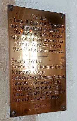 TO THE GLORY OF GOD OUR PRESERVER / AND IN GRATEFUL MEMORY OF / THE MEN OF THIS PARISH / WHO GAVE THEIR LIVES IN THE / GREAT WAR 1914-1919 / THIS PULPIT WAS ERECTED
