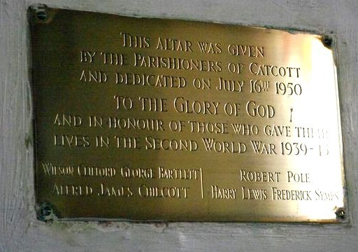 THIS ALTAR WAS GIVEN/ BYTHE PARISHIONERS OF CATCOTT/ AND DEDICATED ON JULY 16TH 1950/ TO THE GLORY OF GOD/ AND IN HONOUR OF THOSE WHO GAVE THEIR/ LIVES IN THE SECOND WORLD WAR 1939 - 1945/ (NAMES)