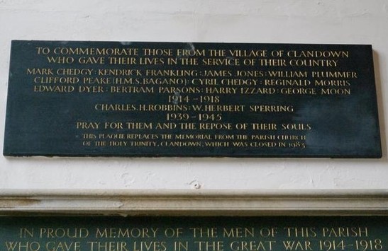 TO COMMEMORATE THOSE FROM THE VILLAGE OF CLANDOWN / WHO GAVE THEIR LIVES IN THE SERVICE OF THEIR COUNTRY / (11 names) / 1914 - 1918 / (2 names) / 1939 - 1945 / PRAY FOR THEM AND THE REPOSE OF THEIR SOULS / THIS PLAQUE REPLACES THE MEMORIAL FROM THE PARISH CHURCH / OF THE HOLY TRINITY, CLANDOWN. WHICH WAS CLOSED IN 1983