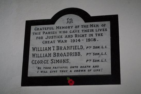 IN/ GRATEFUL MEMORY OF THE MEN OF/ THIS PARISH WHO GAVE THEIR LIVES/ FOR JUSTICE AND RIGHT IN THE/ GREAT WAR 1914 - 1918/ (NAMES)/ "BE THOU FAITHFUL UNTO DEATH AND/ I WILL GIVE THEE A CROWN OF LIFE"