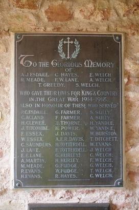 TO THE GLORIOUS MEMORY/ OF/ (NAMES)/ WHO GAVE THEIR LIVES FOR KING AND COUNTRY/ IN THE GREAT WAR 1914 - 1918/ ALSO IN HONOUR OF THOSE WHO SERVED/ (NAMES)