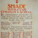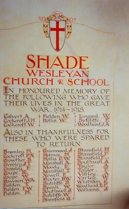 SHADE/ WESLEYAN/ CHURCH & SCHOOL/ IN HONOURED MEMORY OF/ THE FOLLOWING WHO GAVE / THEIR LIVES IN THE GREAT/ WAR 1914-1918/ (8 names)/ ALSO IN THANKFULNESS FOR/THESE WHO WERE SPARED/ TO RETURN/ (35 names)