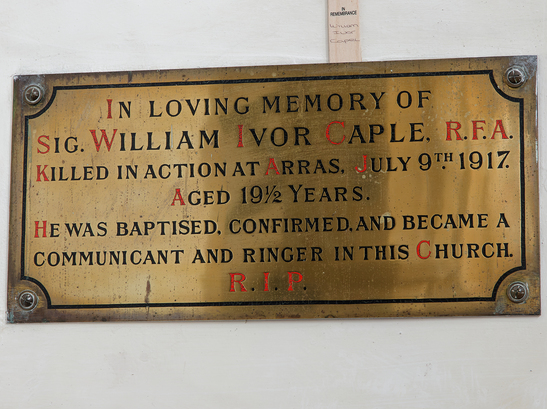 IN LOVING MEMORY OF/ SIG. WILLIAM IVOR CAPLE, R.F.A./ KILLED IN ACTION AT ARRAS, JULY 9TH 1917/ AGED 19 AND A HALF YEARS/ HE WAS BAPTISED CONFIRMED AND BECAME A/ COMMUNICANT AND RINGER IN THIS CHURCH/ R.I.P
