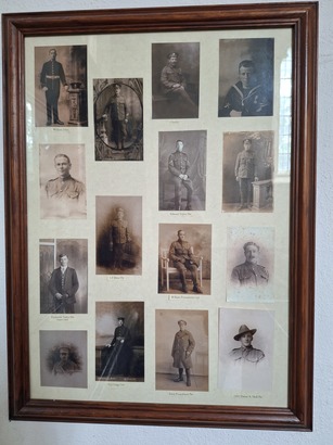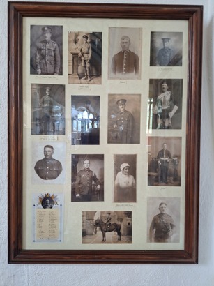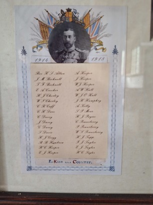 Allan H.S. (Rev.) 2 Lt. (India & France), Bicknell J.M. Sigr. (France), Bicknell T.F. Pte. (France), Crocker E.A. Pte. (Home Service), Chorley H.J. Sgt. (France), Chorley W.H.J. Pte. (Gallipoli, Egypt, Palestine, France), Cuff C.R. (HMS Australia), Dare C.H. Gnr. France, Davey C. Gnr. (France), Davey J. Pte. (France), Davey G. Pte. (France), Davis S. Pte. (France), Grigg H.J. Gnr. (France), Hembrow R.B. (HMS Lion), Hooper H.C. Pte. (Home Service), Hooper E.J. Pte. (France), Hooper A. Pte. (France), Hooper J. Pte. (France), Hooper W.J. Pte. (France), Hull A.W. Pte. (Gallipoli, Egypt, France), Hull W.J.O. Pte. (France), Humphrey J.H. Cpl. (Gallipoli, Egypt, Palestine, France), Mear S.P. Pte. (France), Mear J. Pte. (France), Payne H.J. Dvr. (France), Pounsberry C. Dvr. (France), Pounsberry P. Pte. (France), Pounsberry W.S. Cpl. (France & Salonika), Tapp H.J. Sergt. Major RHMC (France), Taylor F.J. Pte. (France), Taylor E.J. Pte. (France), Taylor H.C. Dvr. (France), Kelly A. V.A.D. Nurse (France & Home).