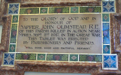 TO THE GLORY OF GOD AND IN HONOUR OF SAPPER JOHN GLIMSTEAD, R.E. OF THIS PARISH, KILLED IN ACTION NEAR YPRES, SEPT. 2ND, 1917, IN THE GREAT WAR. THIS TABLET WAS ERECTED BY PARISHIONERS AND FRIENDS. "WELL DONE GOOD AND FAITHFUL SERVANT"