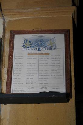 ST MARY'S PARISH CHURCH / MUDFORD / YEOVIL / THE MEN OF OUR PARISH / We pray that these may in God's keeping be / Now and for ever till war's shadows flee. / 1939 - 1945 / (NAMES in four columns)