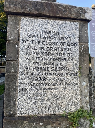 PLWYF LLANGYNWYND ER GOGONIANT I DDUW A CHYDAR COFEA ANWYLAF AM BOB UN OR PLWYF HWN A WNAETH YR ABERTH PENNAF YN Y RHIFFI BYD CYNTAF 1914 - 1918. MEWN ANGOF NI CHANT FOD / PARISH OF LLANGYNWYD TO THE GLORY OF GOD AND IN GRATEFUL REMEMBRANCE OF ALL FROM THIS PARISH WHO MADE THE SUPREME SACRIFICE IN THE SECOND WORLD WAR 1939 - 1945. AT THE GOING DOWN OF THE SUN AND IN THE MORNING WE WILL REMEMBRER THEM.