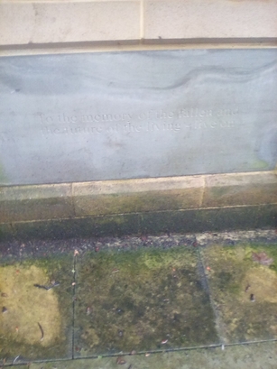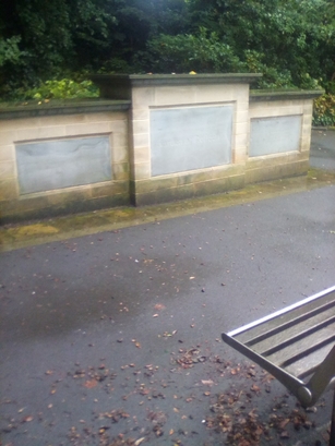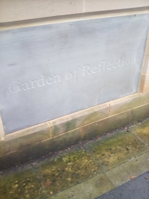Left Hand Panel-To the memory of the fallen and/The future of the living-live on; Central Panel-Garden of Reflection; Right Hand Panel-In memory of [names]/All of our fallen and veterans/We remember them