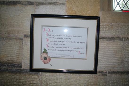 DEAR LORD / THANK YOU FOR ALL THOSE WHO FOUGHT FOR THEIR COUNTRY / AND SADLY DIED FIGHTING FOR VICTORY / WE PARTICULARLY THINK OF THE SOLDIERS FAMILIES WHO SUFFERED / THE LOSS OF THEIR LOVED ONES / THE SOLDIERS MUST HAVE HAD LOTS OF COURAGE AND BRAVERY / TO SAVE THEIR COUNTRY BY DEDICATED THEIR LIVES / AMEN ST JOHN THE BAPTIST CHURCH / SUNDAY CLUB REMEMBRANCE DAY 2002