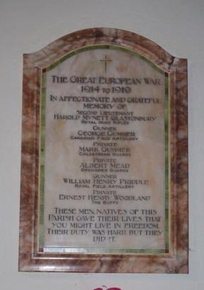 THE GREAT EUROPEAN WAR 1914-1919/ IN AFFECTIONATE AND GRATEFUL MEMORY OF/ (NAMES)/ THESE MEN, NATIVE OF THIS PARISH, GAVE THEIR LIVES THAT YOU MIGHT LIVE IN FREEDOM. /THEIR DUTY WAS HARD, BUT THEY DID IT.